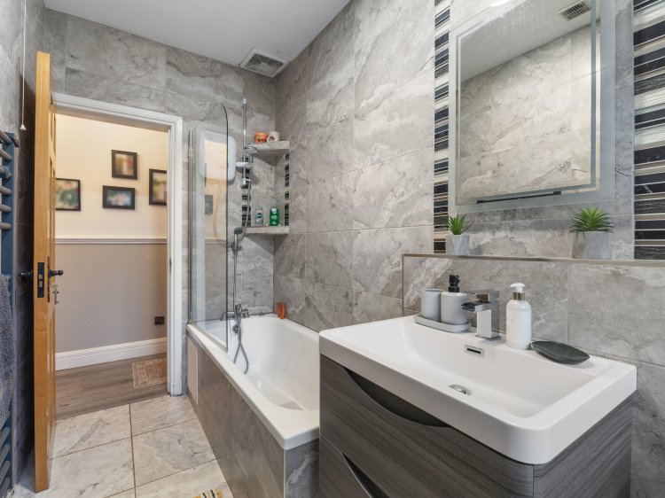 Fully tiled. Includes bath with electric shower fitted over, WC, WHB complete with vanity unit with a fitted mirror over. This room is finished to an excellent standard.