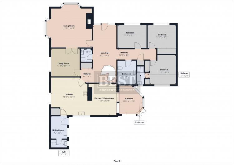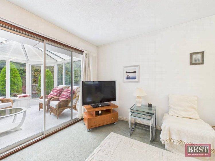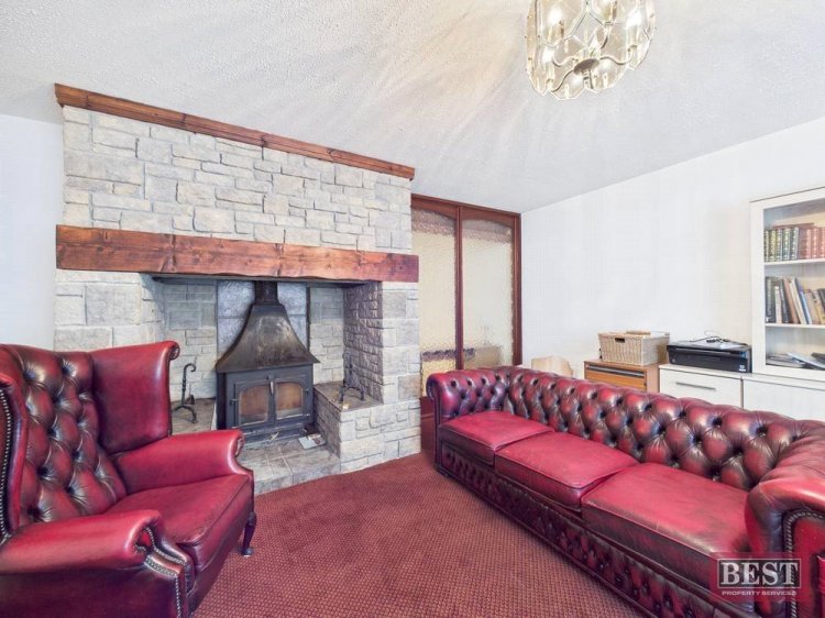 The main level also features a sizeable kitchen, with a striking red AGA that instantly becomes the focal point of the space. From here, the layout flows into a cosy living area and then into a bright sunroom overlooking the garden. A utility room, covered porch area with back door access, and an additional WC complete this floor.