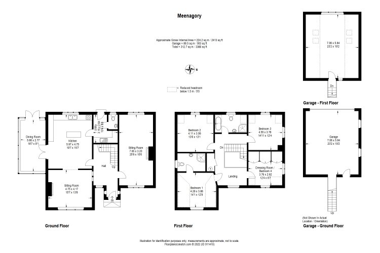 Accommodation & features include: Sitting room inc stove with back boiler – 4.75 x 4.17 (15’7 x 13’8) Fitted kitchen – 5.97 x 4.75 (19’7 x 15’7) Dining/sun room – 5.66 x 2.77 (18’7 x 9’1) Utility room with WC – 3.15 x 2.64 (10’4 x 8’8) Master Bedroom- 4.29 x 3.86 (14’1 x 12’8) with ensuite Bedroom 2 – 4.11 x 3.99 (16’6 x 13’1) Bedroom 3 – 4.55 x 3.76 (14’11 x 12’4) Bedroom/ dressing room – 3.76 x 2.62 (12’4x 8’7) Garage first floor – 7.06 x 5.84 (23’2 x 19’2) Garage second floor – 7.06 x 5.84 (23’2 x 19’2)