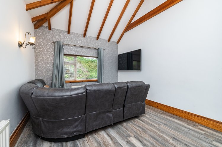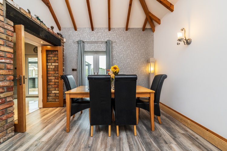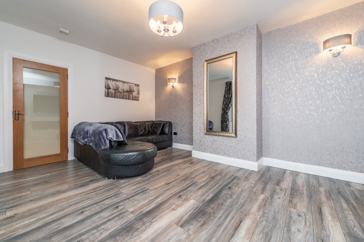 Laminate floor, 15ft vaulted ceiling, French doors to rear garden, walled lights.