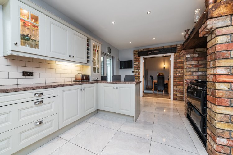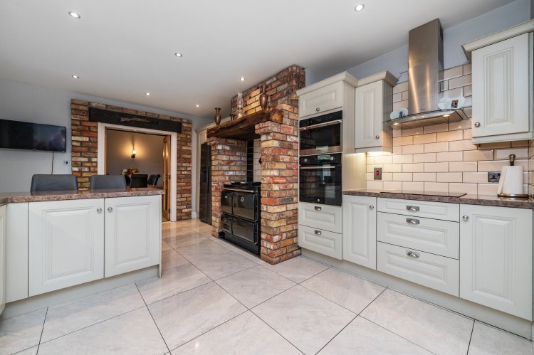 Built-in ground and eye level units with mussel (cream) cupboards, splash back tiles, porcelain floor tiles, stainless steel sink, Stanley solid fuel super star stove cooker/oven with brick surround, integrated oven and microwave, Hotpoint electric hob with Whirlpool extractor, anthracite wall mounted radiator, nickel socket and switches.