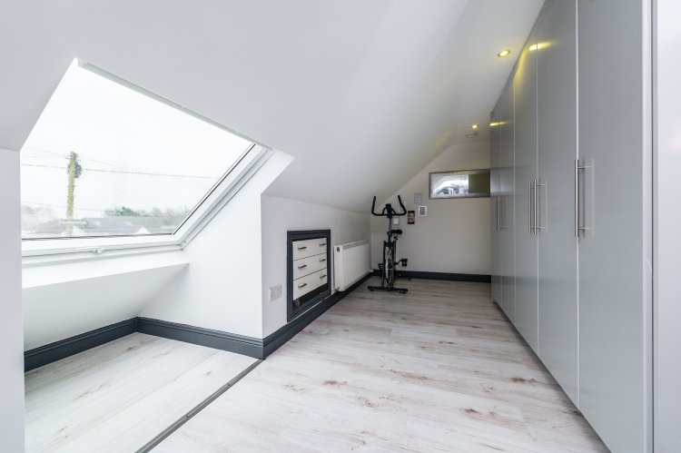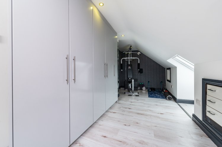 Large bright room with Laminate floor, recessed lights and eaved storage.