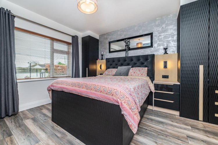 Laminate floor, wall lights, bay window, feature/media wall with integrated fire, nickel sockets and switches.