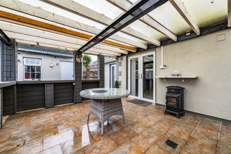Entertainment/BBQ room with Perspex roof and tiled floor.