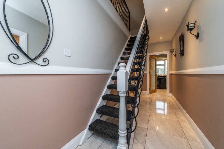 With bespoke wrought iron stairs, porcelain tiles, recessed lights.