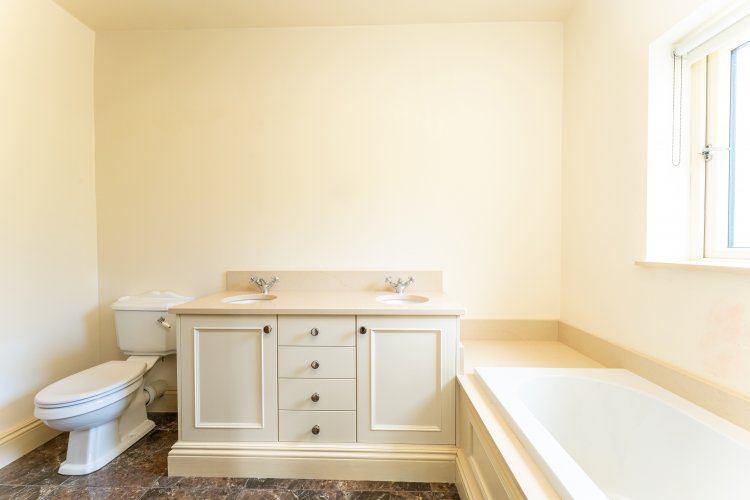 En-suite tiled floors and shower enclosure, bath, double WHB vanity unit, toilet
