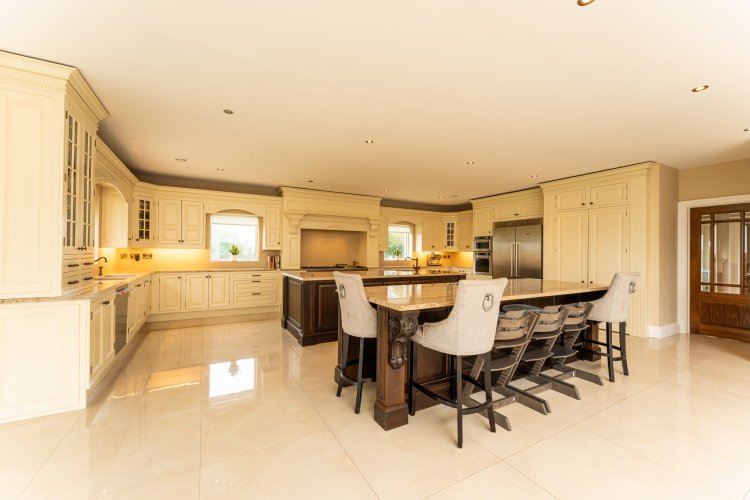 Kitchen/diner Triple aspect, Tiled flooring, solid in frame kitchen units with granite counter tops, Belfast sink x 3, ?Perrin & Rowe? water filtration, sink waste disposal unit, kitchen island and secondary breakfast bar, stainless stell ?kitchen aid? dishwasher, fridge freezer, oven, microwave oven and ?ilve? gas fuelled range cooker top and double electric oven, walk in pantry, double doors onto south facing patio