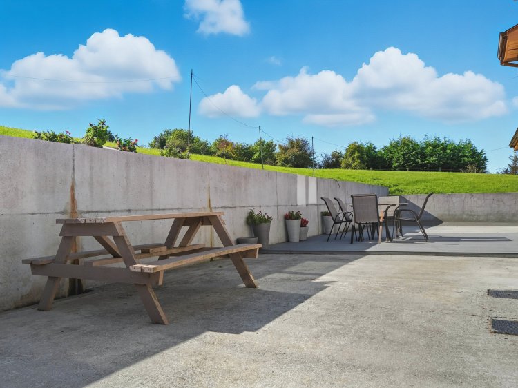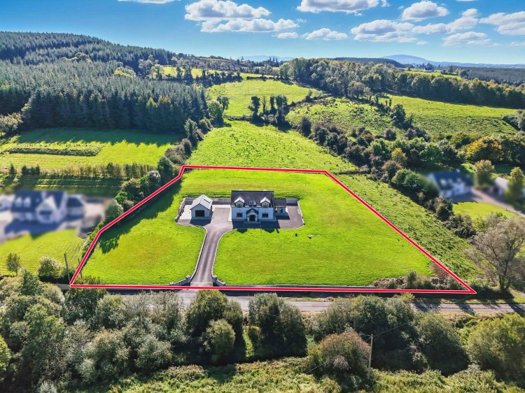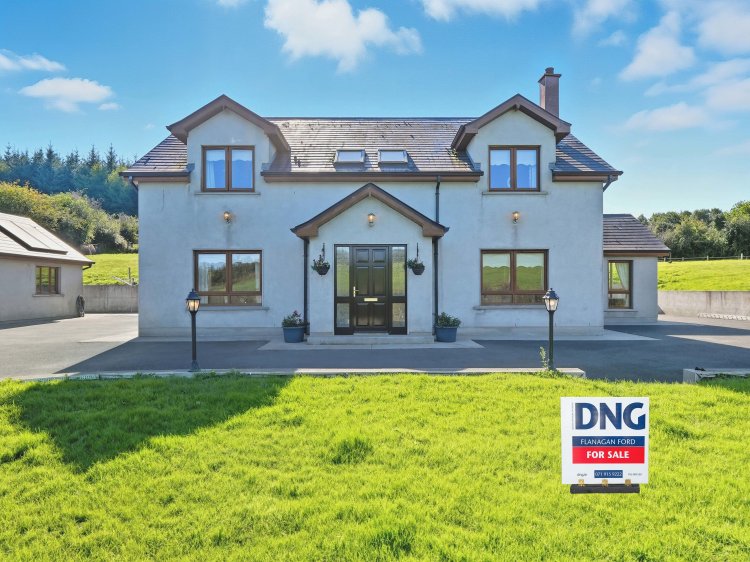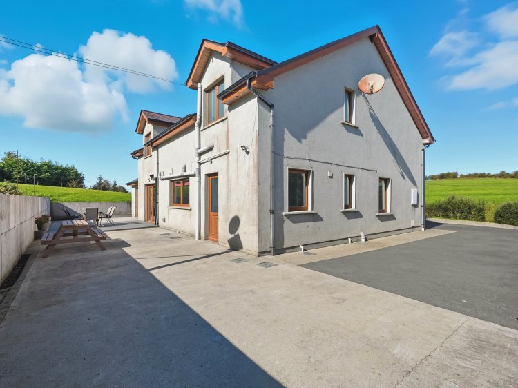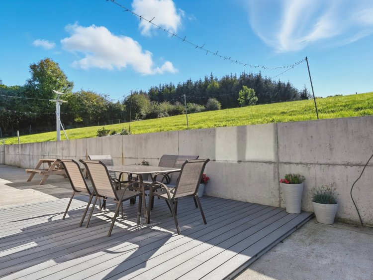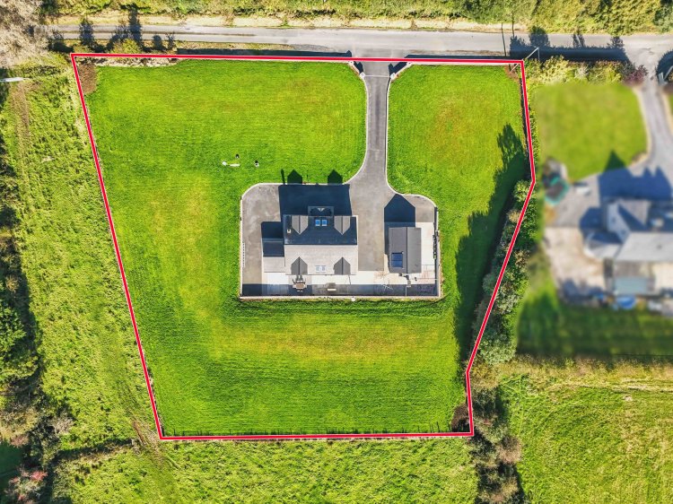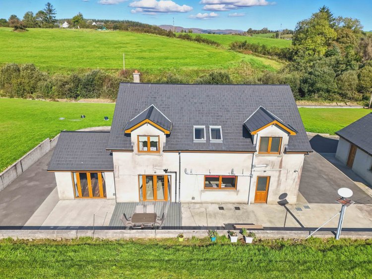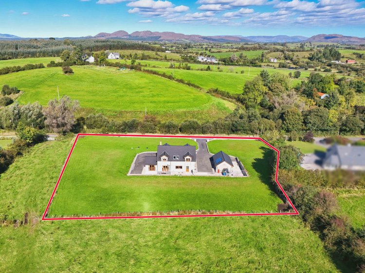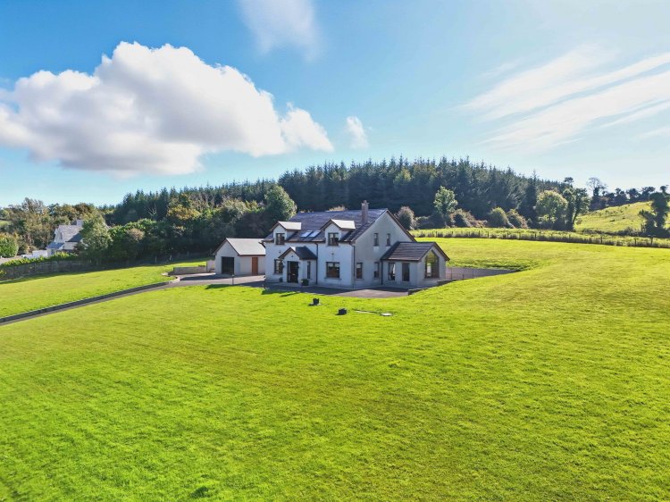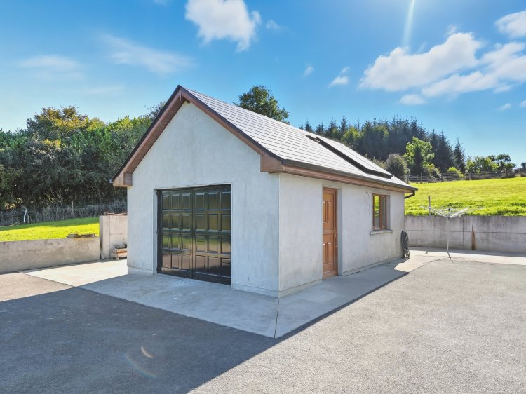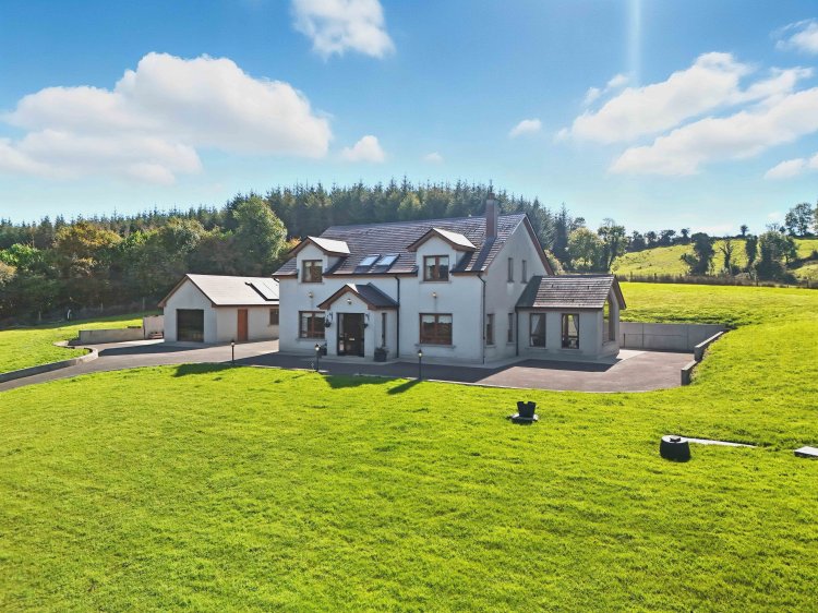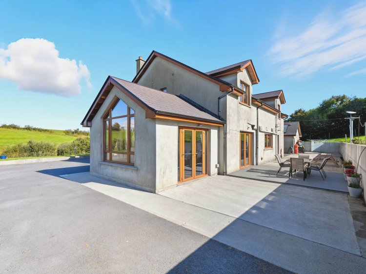 Built in 2009, this detached two-storey house includes an entrance porch and hallway, large living room with open fireplace, and an open-plan kitchen, dining, and sun lounge area with access to a south-facing patio. The ground floor also has a utility room with guest WC, storage, and a downstairs bedroom or additional sitting room. The first floor includes three bedrooms, two with ensuites, a main bathroom, and a walk-in wardrobe off the master bedroom. The property has uPVC double glazed windows and doors, oil-fired central heating, mains water, and a septic tank. A detached block-built garage with attic storage is located to the side of the house.