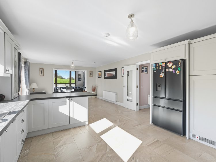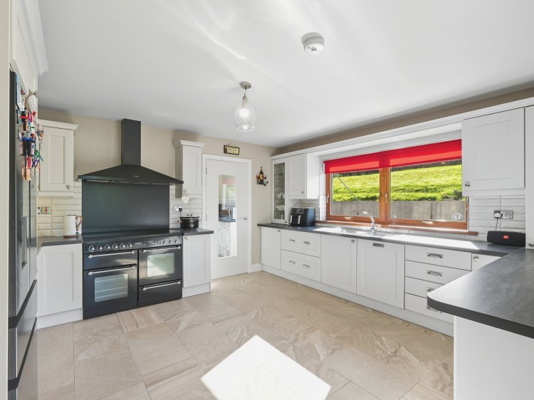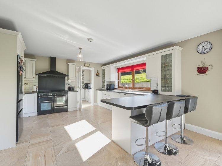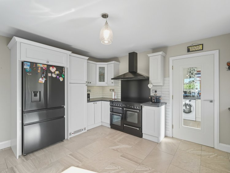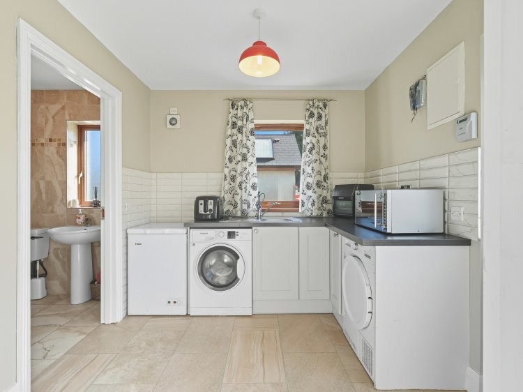 Finished with tile flooring and fully fitted kitchen. Included in the sale are a Rangemaster oven and an American style fridge/freezer. The backsplash is fully tiled. There is an integrated dishwasher and this room is open to the utility area. |