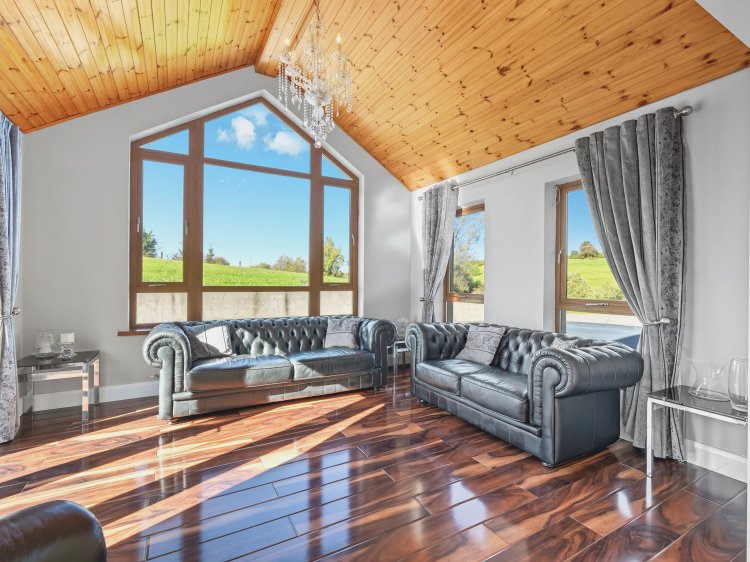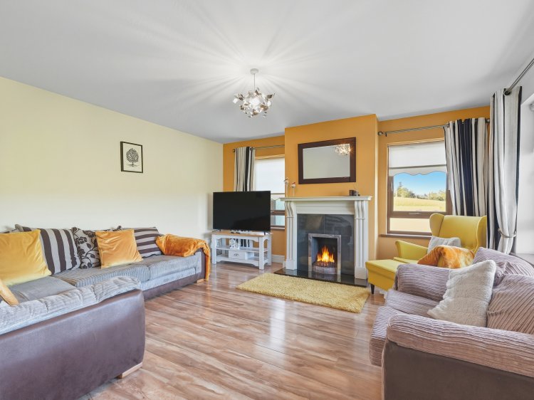 Laminate wood flooring and open fireplace. It is a beautiful bright room with three windows, two on the gable and one to the front overlooking the large lawn. |