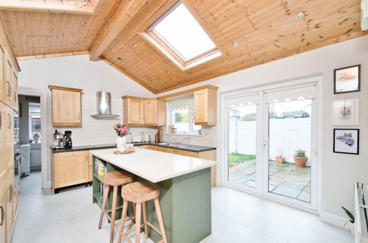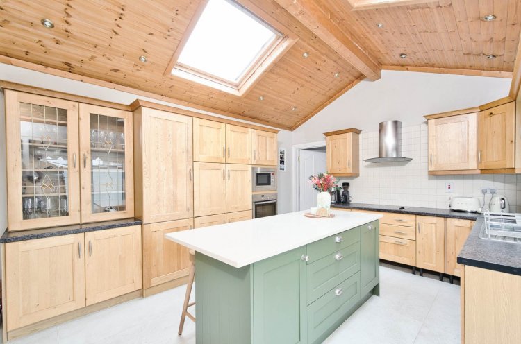 Kitchen 4.9m x 3.9m Tiled floor, solid oak wall and floor units, tiled splashback, double French doors to patio area, recessed lights, Velux windows, island and breakfast bar with storage, integrated Neff oven, Neff hob, microwave, dishwasher, kitchen extractor fan, integrated fridge-freezer, larder unit and light fittings.