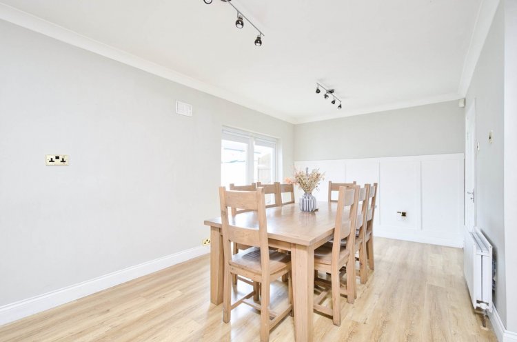 Family Room/Dining Area 7.8m x 4.4m Laminate flooring, Lindby spotlights, electric fire place, semi-panelled wall, double French door leading to rear garden, roller blinds and storage closet.