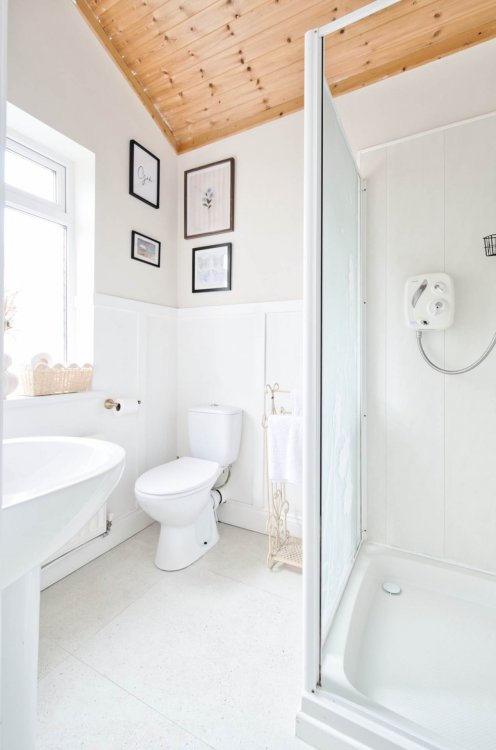 Family Bathroom 1.9m x 2.1m Fully tiled bathroom, w.c., w.h.b., fitted toilertries cabinet with shelves and mirror, window, bath with triton shower system and shower screen.