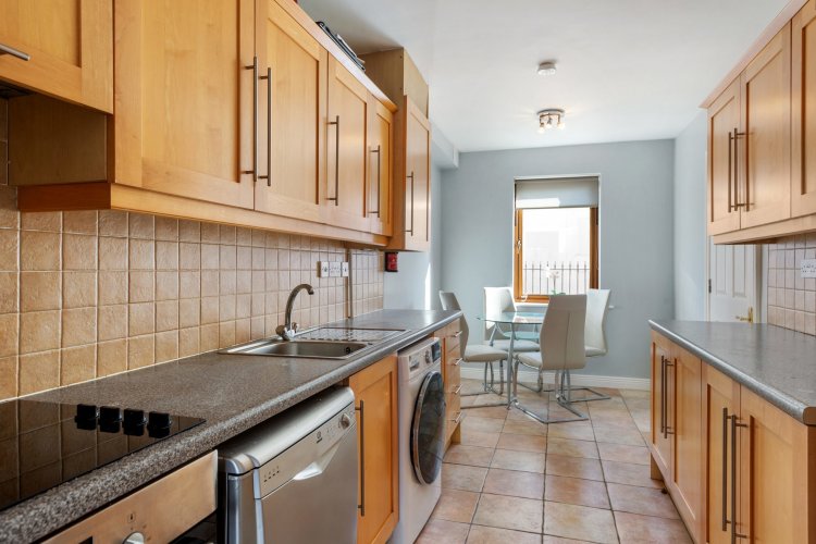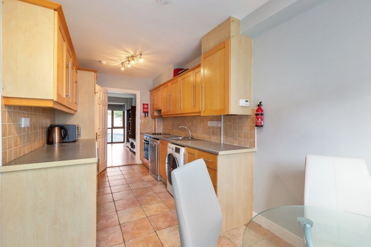 Kitchen 5.44m x 2.38m Tiled floor. Range of wall and floor units. Integrated oven, hob and extractor fan. Plumbing for washing machine. Plumbing for dishwasher.
