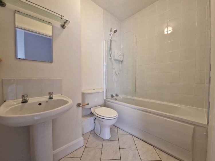 Bathroom Tiled Flooring and splashback, tiled bath enclosure and shower screen, toilet, WHB, bath, electric shower